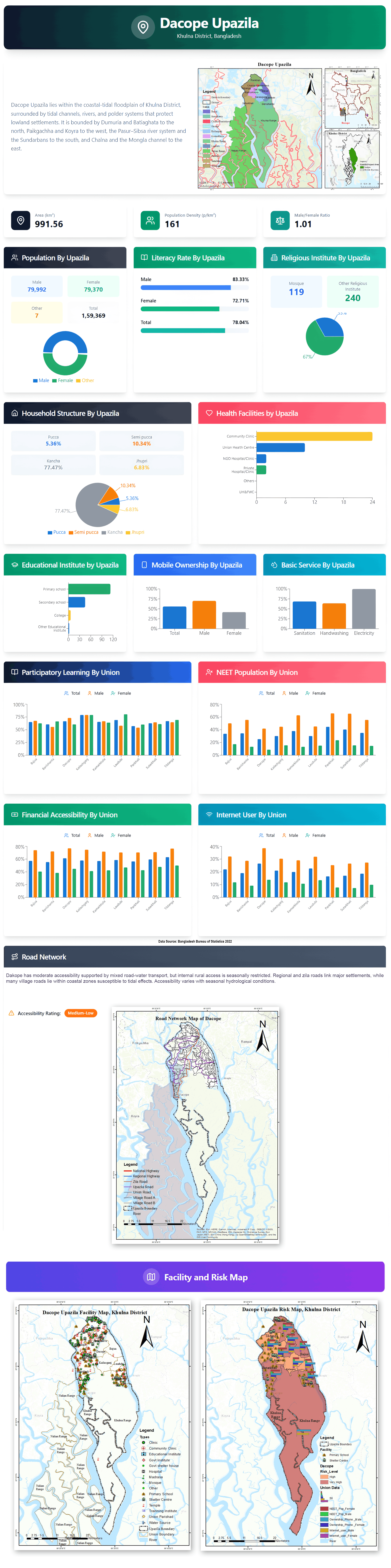 Public health facilities include 10 Union Health Centres and 24 community clinics.