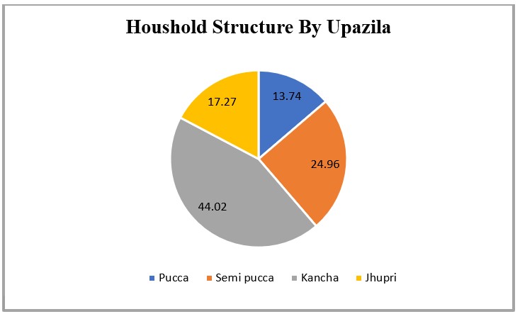 Displacement risk in Teknaf is amplified by the high proportion of weak household structures. Although the population density is moderate at 859 persons per km², the combination of significant kancha housing and one of the highest shares of jhupri structures makes the area susceptible to disaster-related displacement. Moderate sanitation levels provide only limited resilience, resulting in an overall displacement risk rated as medium–high.